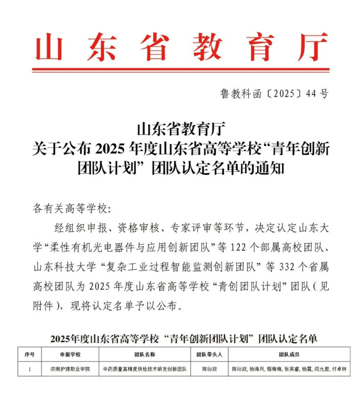 近日,山东省教育厅公布了2025年度高等学校“青创科技计划”创新团队认定名单。由学院药学系陈衍政博士作为带头人的“中药质量高精度快检技术研发创新团队”成功入选,标志着学院首次实现省级科研创新团队的历史性突破。该团队汇聚了多位青年博士,研究领域涵盖生物医药研发、纳米材料合成、微流控芯片技术及药物分析检测等方向,形成了跨学科协作的科研合力。